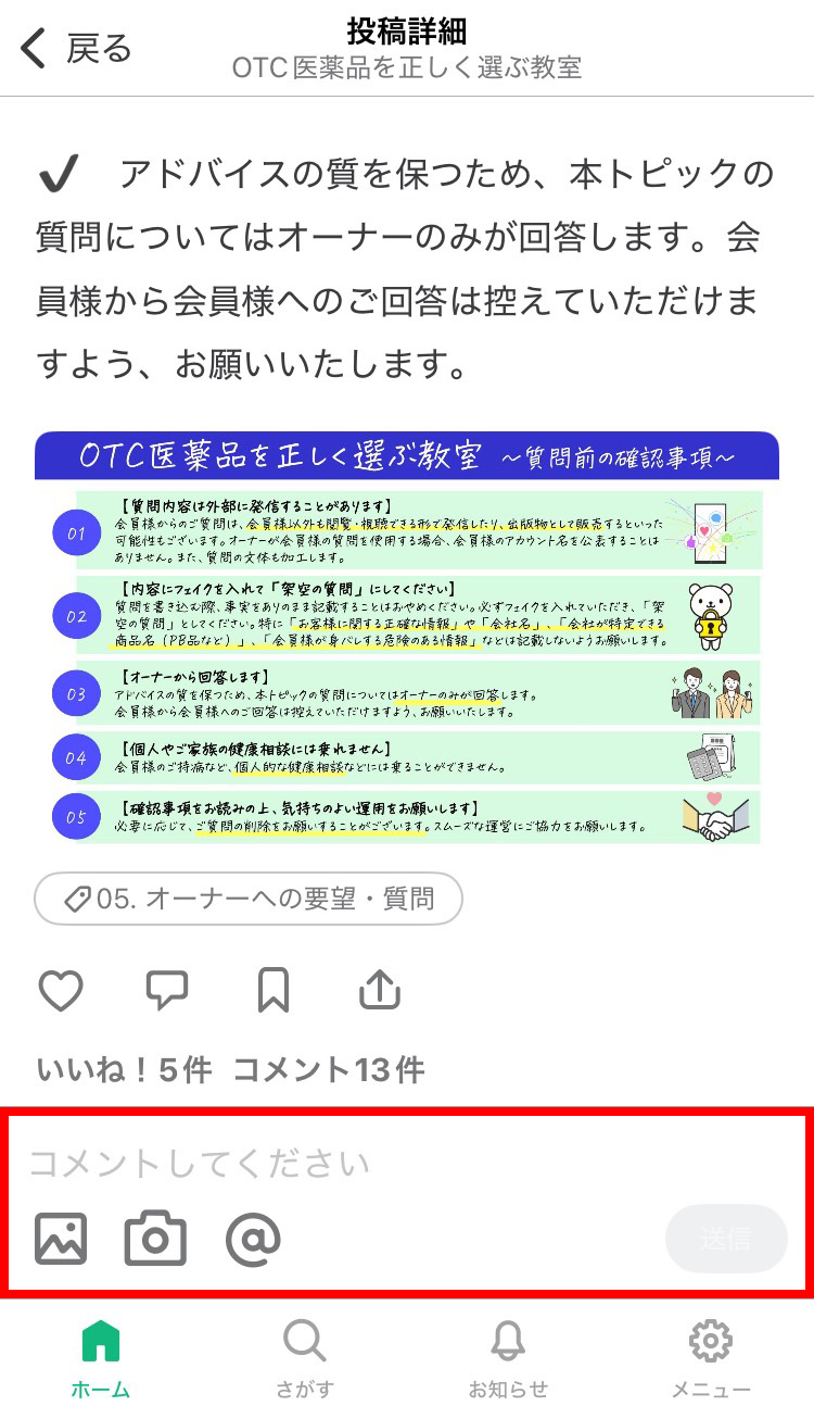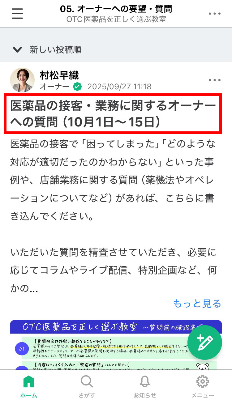 「医薬品の接客・業務に関するオーナーへの質問」というタイトルの投稿をクリック